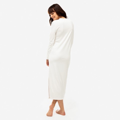 Chemise de nuit longue, manches longues en coton interlock, col tunisien boutonné avec passepoil contrasté noir.