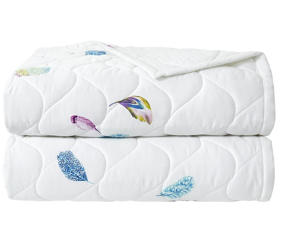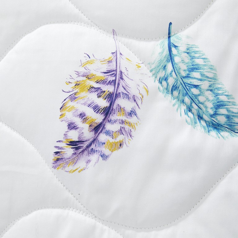 Le dessus de lit matelassé Céleste est imprimé sur satin de coton peigné longues fibres bio, 120 fils/cm².Matelassage ondes, finition retour de 3cm.Motif jeté de plume sur satin de coton blanc. Dos uni.Légèreté, pureté et dessin ultra sophistiqué aux teintes de bleu pétrole et fushia.