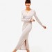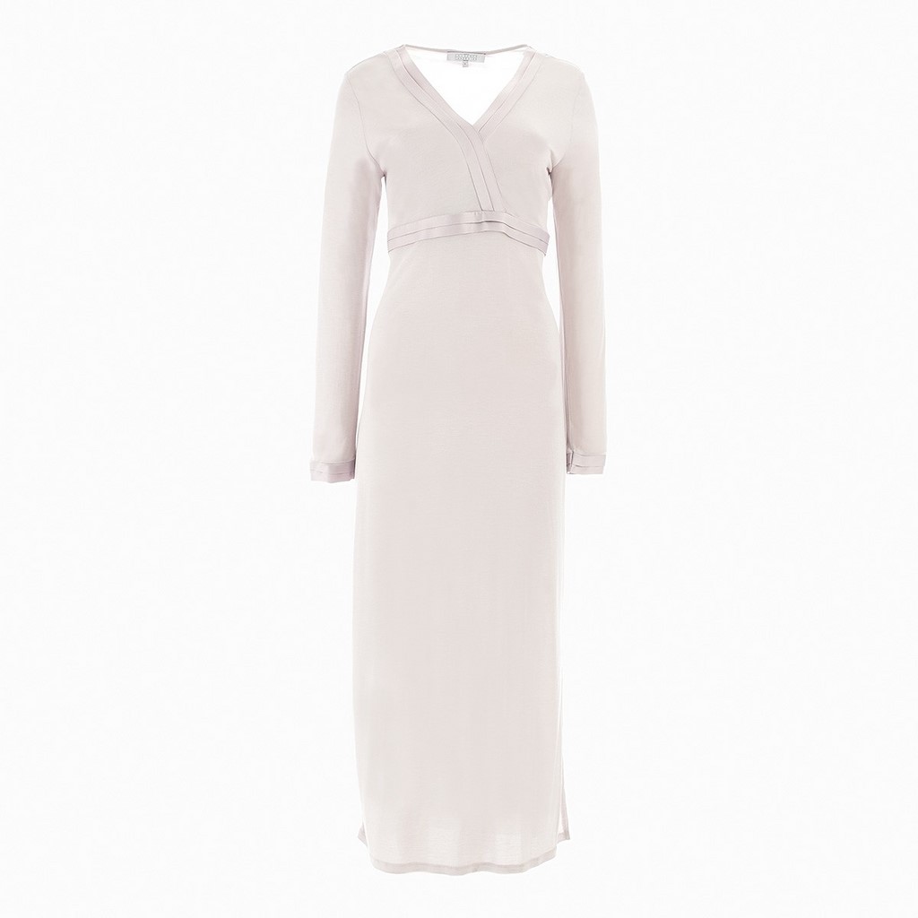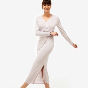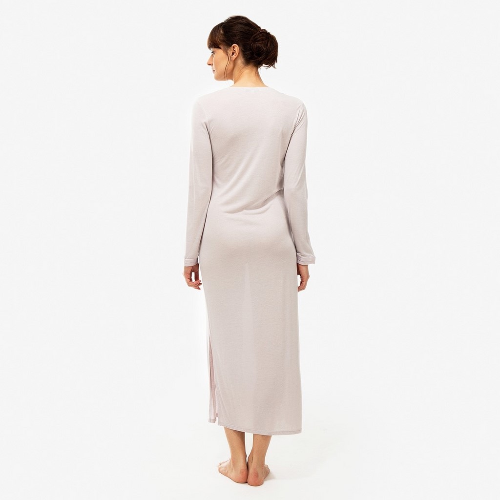 Chemise de nuit longue, manches longues, col V en jersey modal et soie avec finitions en plis satin à l'encolure et aux poignets.